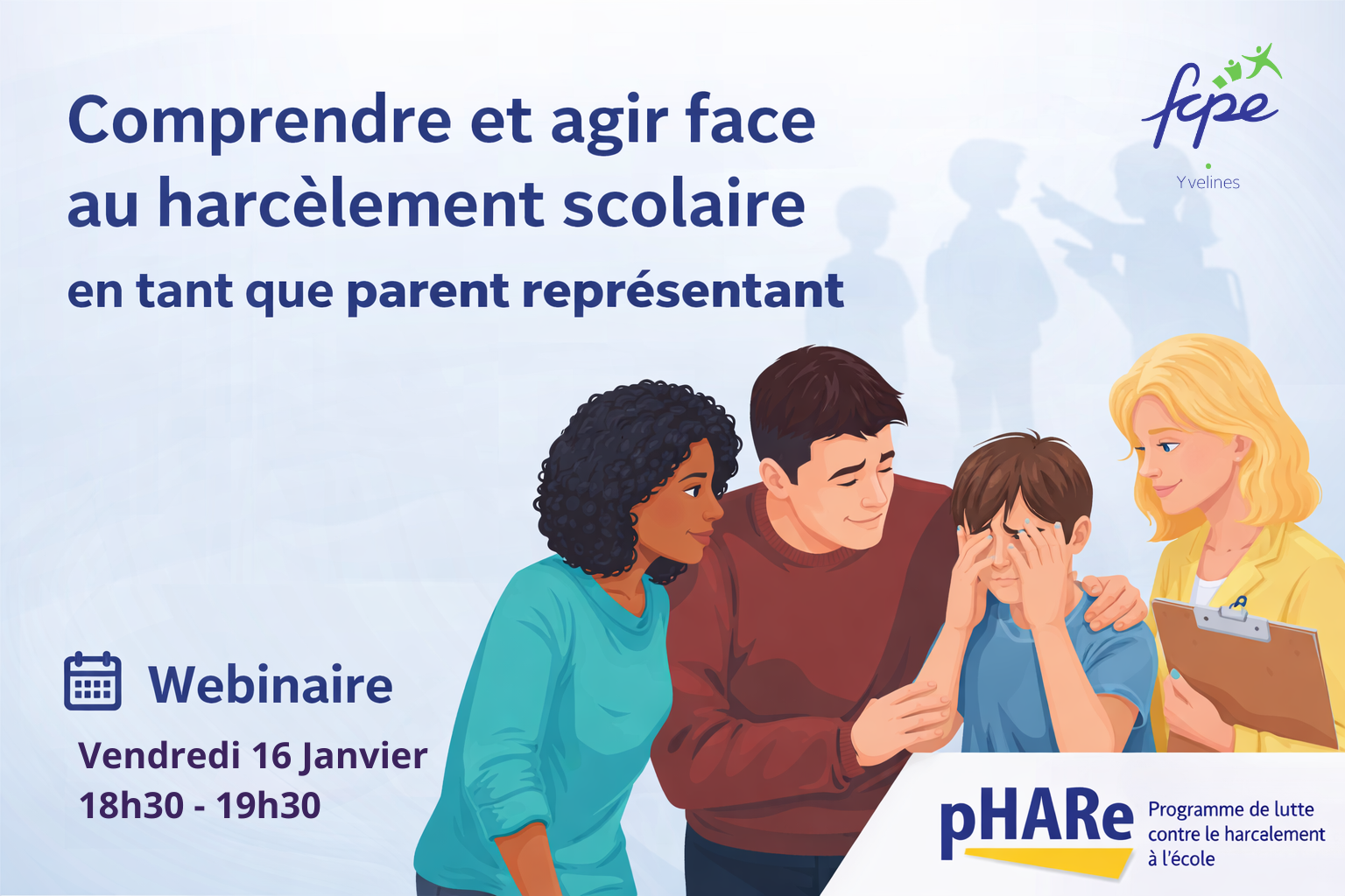 ➡️ Ce webinaire s’adresse aux représentants des parents d’élèves (école / collège / lycée) et à tous les parents volontaires qui souhaitent mieux comprendre le harcèlement scolaire, savoir comment réagir efficacement et jouer un rôle actif dans la prévention au sein de l’établissement.